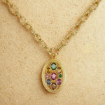Inspired by the way light disperses into colour, the Prism Necklace showcases an oval pendant set with natural tourmalines in a radiant spectrum of hues. Each stone reveals its own character — from soft greens to warm ambers, pink tones, and deep blues — creating a harmonious composition that catches the eye from every angle.