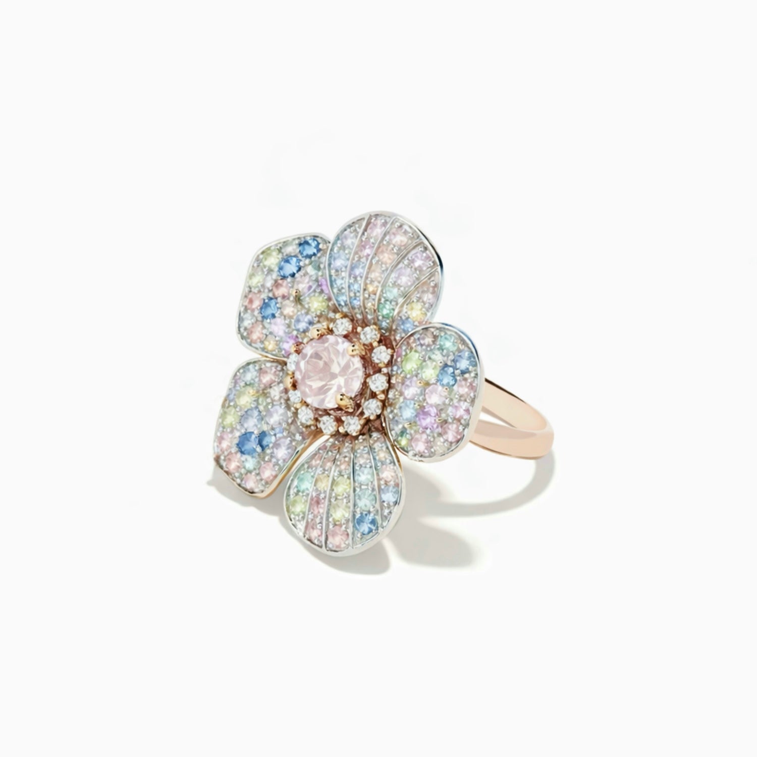 A floral composition where natural pastel sapphires create a luminous, nuanced palette.